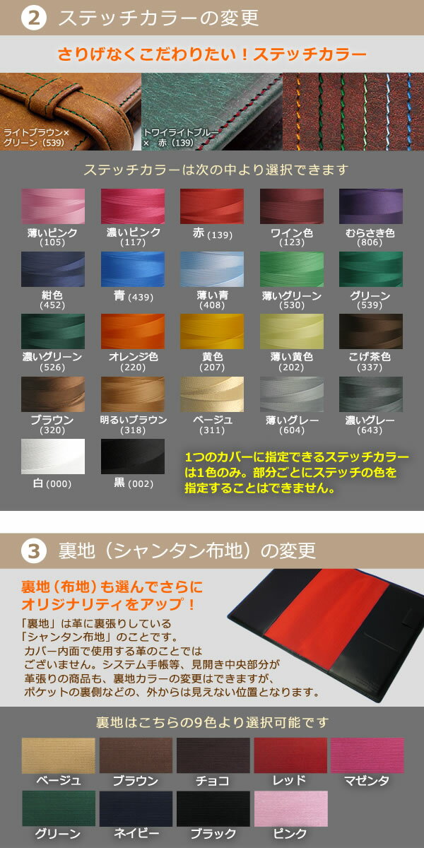 カバー本体のご注文ページで「ステッチカラー」の選択肢があり、受注メール等のご注文内容でもそのまま「ステッチカラー:革と同系色」等と表記されておりますが、本ページでステッチカラーのカスタマイズをご指定頂いた場合は、本ページでのカスタマイズ指定が優先されます。