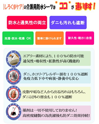 ギフト・ラッピングをご希望の方は⇒クリック 商品詳細 ■介護用全面防水シーツ■ サイズ : シングル(100cm×200cm×10cm) 素 材 : ポリエステル100% (透湿性ポリウレタン樹脂コーティング) カ ラー : ホワイト(研究結果ダニが一番嫌う色) ◎ 防水防ダニW効果で、驚きの薄さ0.2mm以下 ◎ 透湿性テスト:1時間あたり 40g/1m2 ◎ 特殊な”防水透湿性素材”で、蒸れや冷えを解消 ◎ 汗シミ、黄ばみ、ニオイ、カビなどの心配もありません ◎ ダニ、ホコリ、花粉、アレルギー源全て遮断!寝具の寿命も延長 ◎ 日本の公的検査機関で品質検査済【防水性】【透湿性】【ハウスダスト・ダニ 通過率0%】 ◎ 薬剤不使用の為、洗濯をしても防ダニ効果持続 新しい寝具に使用 ⇒ 寝具は汚れずいつまでも新品同様でお使いいただけます。